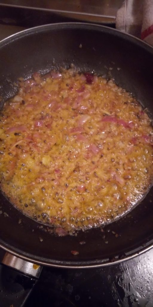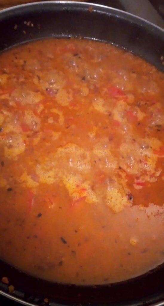 3) Dans une poêle je verse mon huile et mon beurre, une fois bien chaude je rajoute mon oignon et mon poivron (tomate concassée et piment aussi si j’en utilise) je fais revenir tout cela 5 min