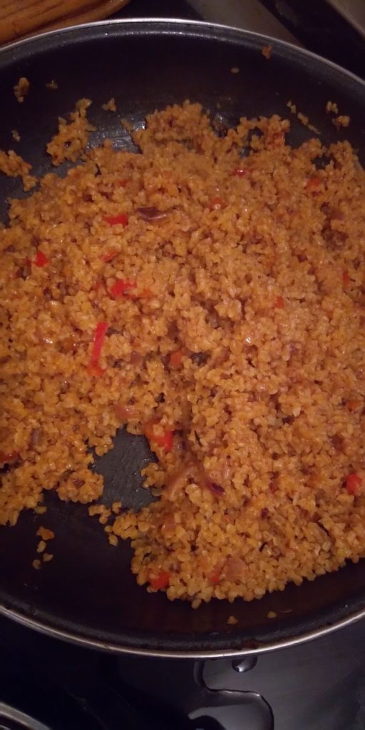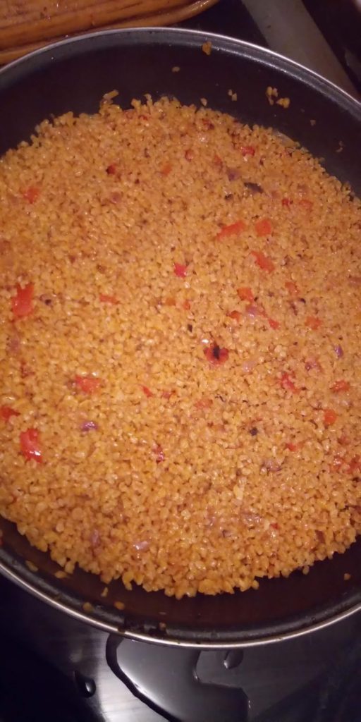5) j’ajoute mes deux verres de bouillon, je mélange bien puis j’ajoute mes deux autres verres d’eau bouillante je mélange couvre et baisse le feu à feu moyen/doux jus’qu’a cuisson (env 15/20min ou jusqu’à ce qu’il n’y est plus d’eau, le boulgour doit rester un peu croquant).