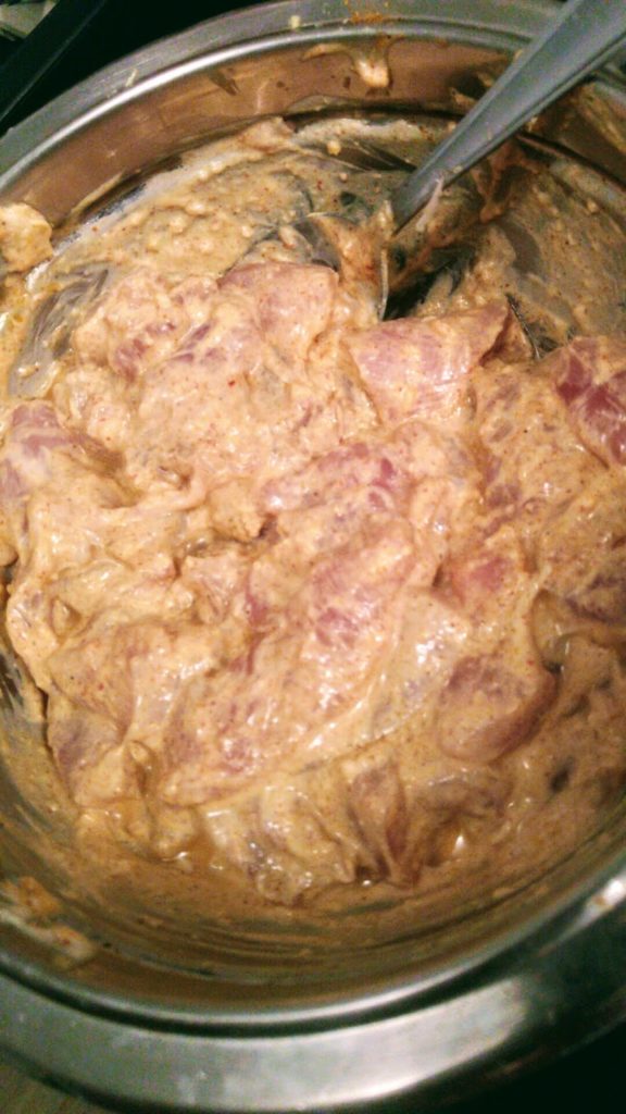 1) couper vos morceau de poulet en carré de 2cm environs les déposés dans un saladier et rajouté le yaourt, 2cm de gingembre râpé, 2 gs ail écrasé, le jus de citron, 1cs de garam madsala, 1cc de poudre piment, 1cc paprika, 1cc sel et 1 filet d’huile mélangé puis réservé au frais min 2h au mieux 1 nuit.