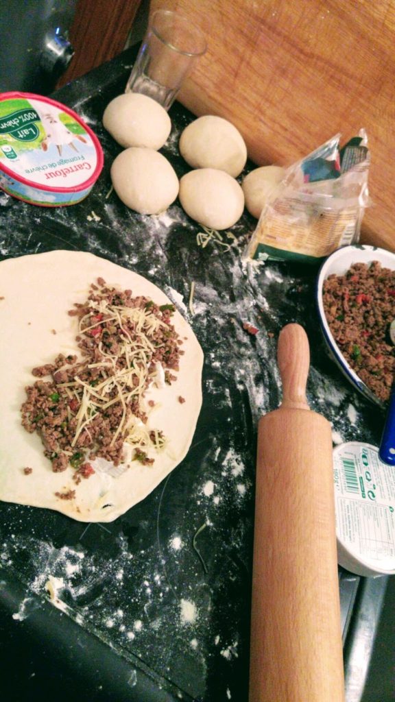 1)Divisez la pâte en 7 boules égales, étalez finement sur le plan de travail en forme de rond, mettez de la farce refroidie d’un côté puis repliez en soudant bien les bords.