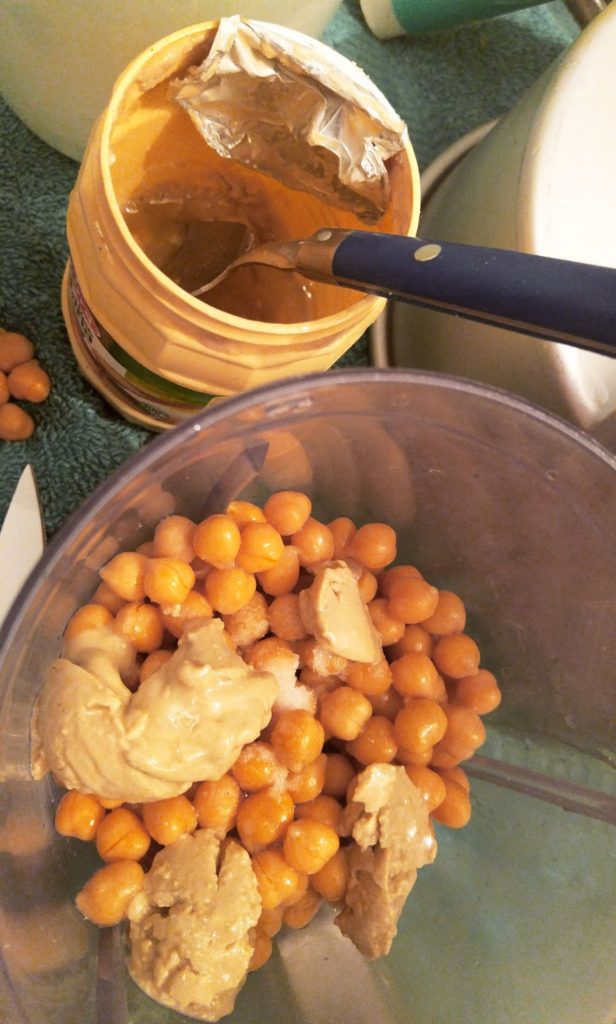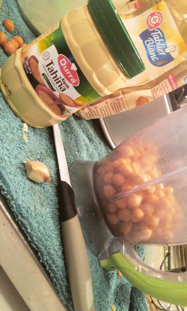 1) Dans votre mixeur déposé vos pois chiches (gardez en 10 pour la déco) , votre jus de citron , une bonne pincée de sel, votre huile olive et vos 4cs de Tahiné (si vous n’êtes pas habitué ou que vous n’aimez pas trop de tahiné allez y progressivement en commençant par 2 cs )