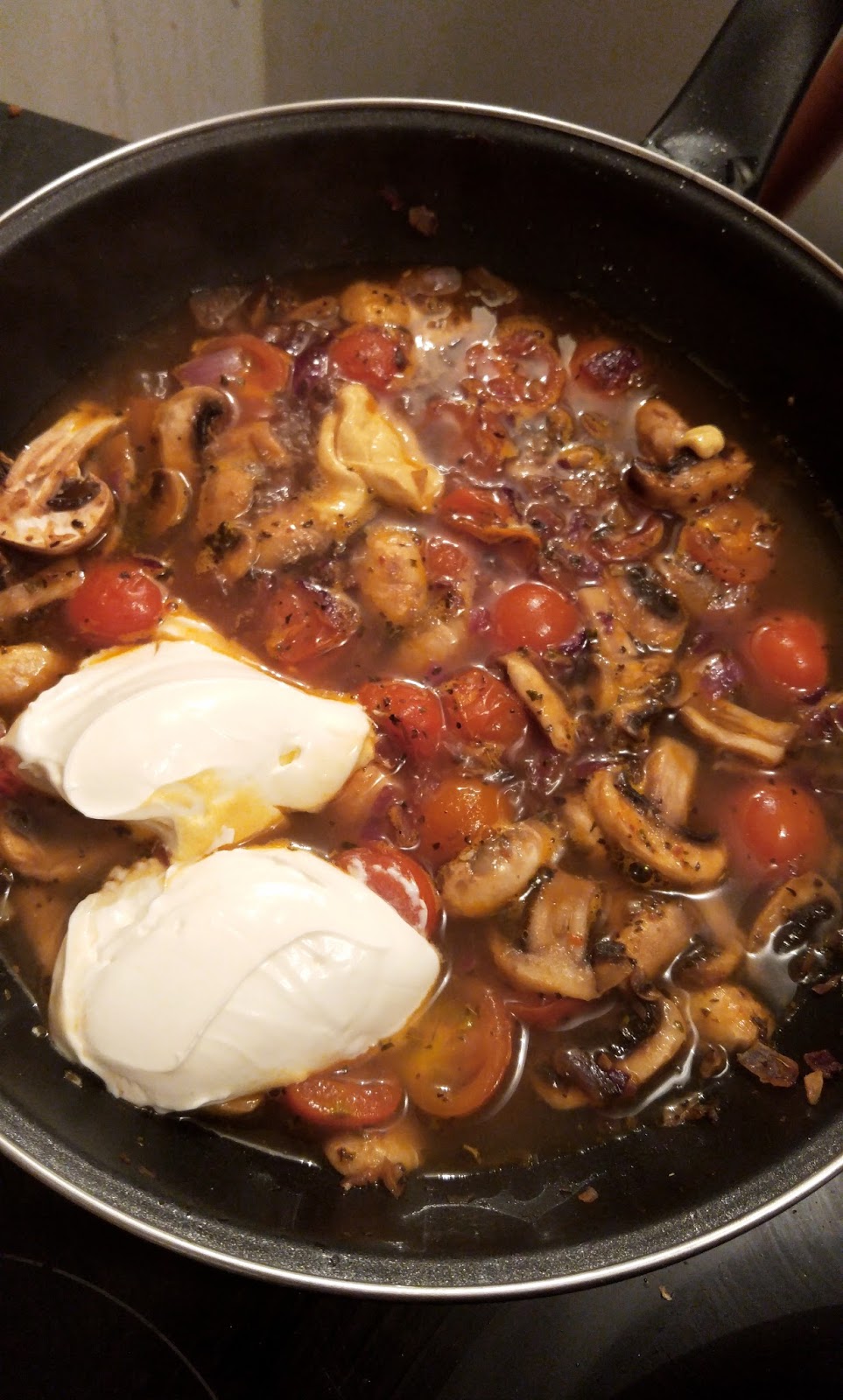 2) On ajoute les tomates coupées en deux, les champignons coupés en lamelle et on laisse revenir 5min à feu moyen.